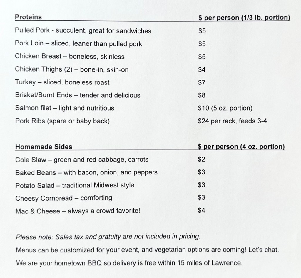 If you’re interested in supporting a local food producer and having some great BBQ at your wedding or reunion, be sure to reach out to Trav’s BBQ. His pulled pork and brisket are better than big name places in KC.